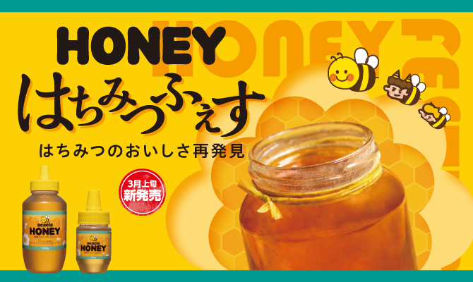 はちみつはミツバチが集めた花の蜜が原料で、花の種類によって風味が異なる天然の甘味料です。はちみつは大きく分けると1種類の花から集められた「単花蜜」とたくさんの花から集められる「百花蜜」があり、新発売の「純粋アカシアはちみつ」はアカシアの花から集められた「単花蜜」です。アカシアの上品な香りとクセのない甘さが特長で、さっぱりとした甘さと上品な味わいはどんな料理にも合わせやすく、料理の風味を損ねません。