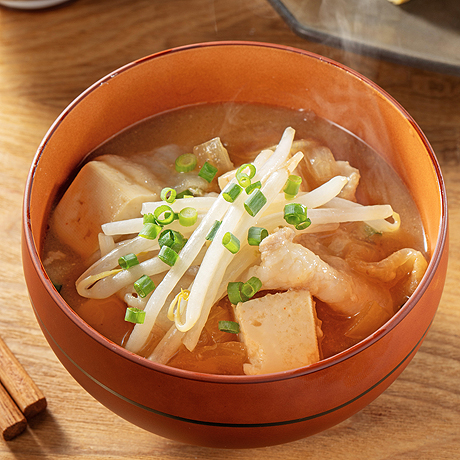 シャキシャキのもやしがアクセント、シンプル豚汁風です。