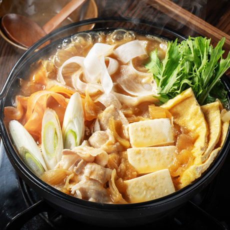 とろとろ玉ねぎが入った濃厚な味噌スープでいただく鍋です。