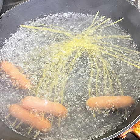 飾り用の切れてるチーズは型で抜く。ウインナーはスパゲッティを5本ずつ刺しす。スパゲッティが柔らかくなるまでゆで、ウインナーに巻きつける。