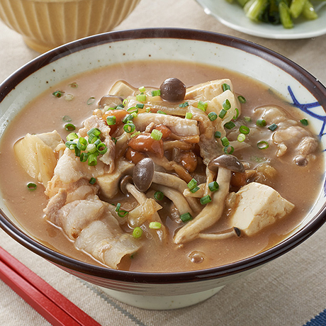 「ふくふく汁の素」は豚やかつお節の旨みを効かせた味噌ベースの調味料です。玉ねぎをたっぷり入れて、野菜と一緒に食べておいしいスープができあがります。豚肉を入れて豚汁風、もつを入れてもつ煮風のアレンジもおすすめです。