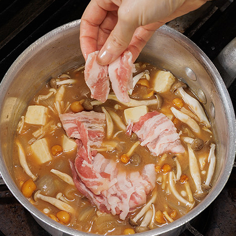 2に豆腐・きのこ・豚肉を入れ、豚肉に火が通るまで煮る。