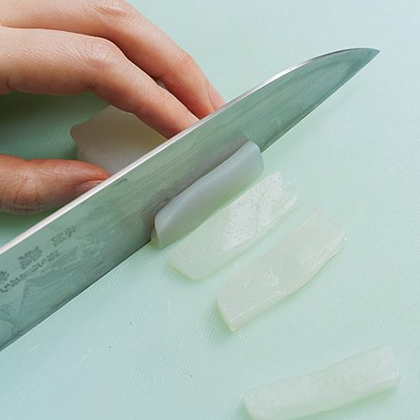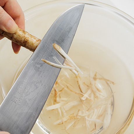 こんにゃくは下ゆでして短冊切りにする。小ねぎは小口切りにする。