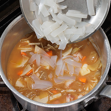 鍋にふくふく汁の素と玉ねぎを入れ、蓋をして弱火で20分ほど煮る。