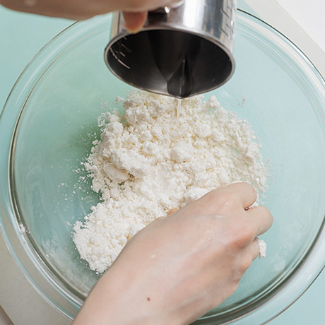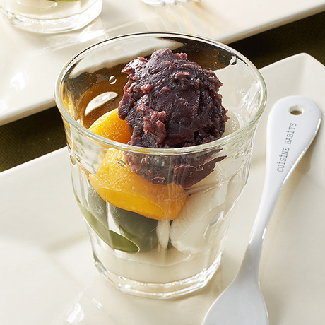 白玉団子を作る。白玉粉に分量の水を少しずつ入れて混ぜ合わせ、耳たぶくらいの固さにする。2cm大に丸め、真ん中を潰す。