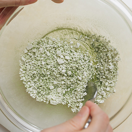 抹茶団子を作る。白玉粉に抹茶を加え、分量の水を少しずつ入れて混ぜ合わせ、耳たぶくらいの固さにする。2cm大に丸め、真ん中を潰す。