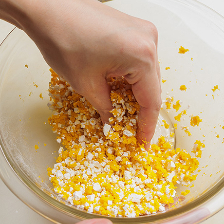 かぼちゃ団子を作る。かぼちゃは皮をむいてひと口大に切り、沸騰した湯に入れてやわらかくなるまでゆでる。水気をきって裏ごししてペースト状にする。白玉粉にかぼちゃを入れてよく混ぜ合わせる。分量の水を少しずつ入れて混ぜ合わせ、耳たぶくらいの固さにする。2cm大に丸め、真ん中を潰す。