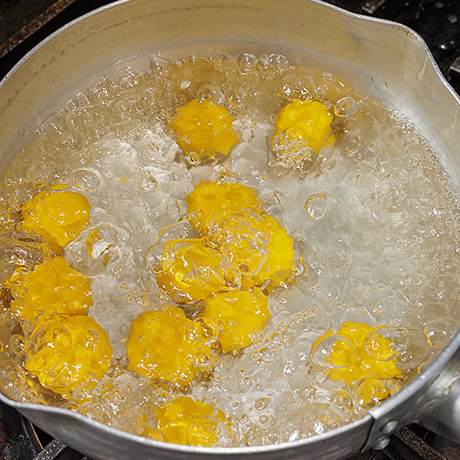 沸騰した湯に1の団子を入れてゆで、浮き上がってきたらさらに1分ほどゆで、冷水にとる。同様に3・2の順でゆでる。