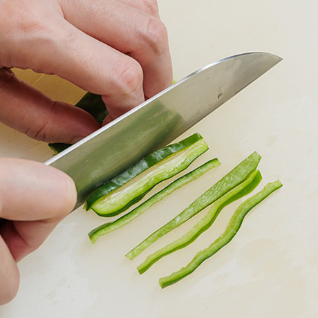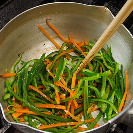 鍋にサラダ油を温め、ピーマン・人参を入れて炒める。野菜がしんなりしてきたら調味料を入れて煮詰める。
