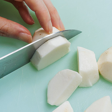 里芋はひと口大に切り、電子レンジで1分ほど加熱する。しめじは石突をとり、小房に分ける。長ねぎは縦半分に切って斜め切りにする。