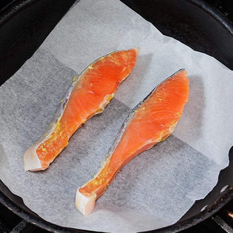 フライパンにクッキングシートまたは魚焼き用ホイルシートをしく。銀鮭西京漬を盛り付ける面を下にして並べ、弱~中火で5~6分焼き、焼き色がついたら返す。さらに4~5分焼く。