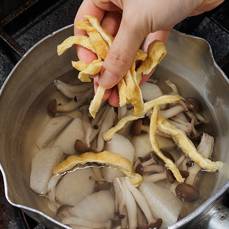 鍋に水・和風だしの素・里芋・しめじを入れて火にかける。里芋に火が通ったらきざみ揚げを入れ、味噌を溶き入れる。最後に長ねぎを加える。