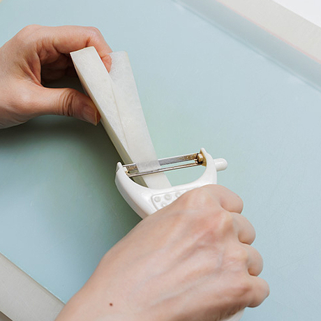 れんこんは薄切りにして水にはなす。大根はピーラーでリボン状にむく。豚肉は3cm長さに切る。しめじは石突をとり、小房に分ける。油揚げは油抜きして4等分に切る。