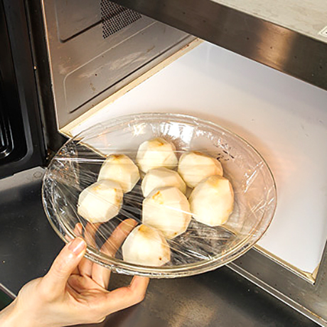 里芋は皮をむいて耐熱皿に入れ、電子レンジで3分ほど加熱して火を通し、半分に切る。
