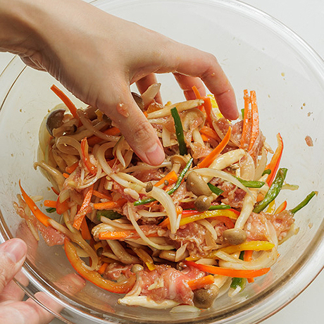 手順1 手順1玉ねぎは薄切りにする。ピーマン・パプリカ・人参は細切りにする。しめじは石突をとり、小房に分ける。