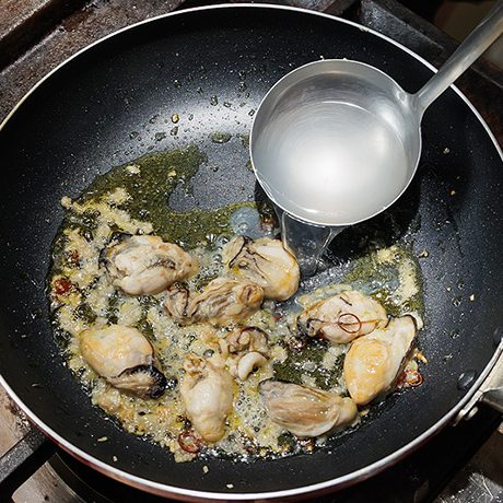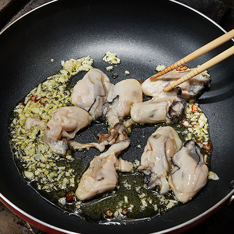 手順4 手順4フライパンにオリーブオイル・にんにく・赤唐辛子を入れる。弱火で香りが出るまで炒め、かきを加えて火を通す。