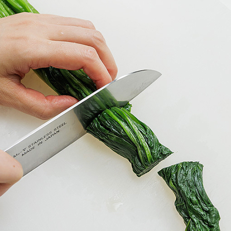 手順3-1 手順3-1白菜は食べやすい大きさに切る。ほうれん草はゆでて3cm長さに切る。えのきは石突をとり、半分に切る。