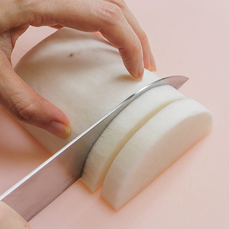 手順2 手順2大根は1cm厚さの半月切りにする。