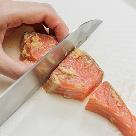 手順1 手順1銀鮭新潟漬はひと口大に切る。しょうがは薄切りにする。