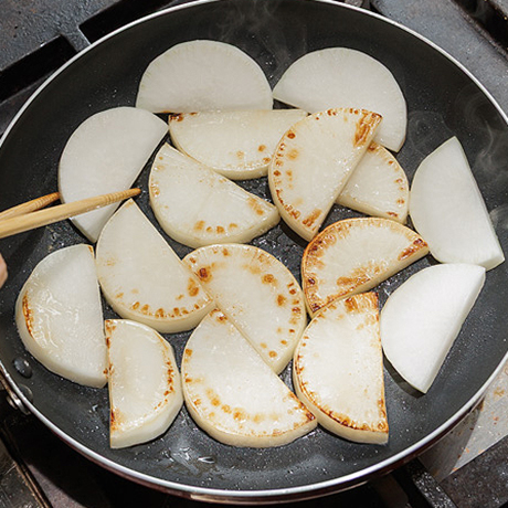 手順5 手順5フライパンにサラダ油を温め、大根を焼く。表面に焼き色がついて透き通ってきたら1・4を入れる。