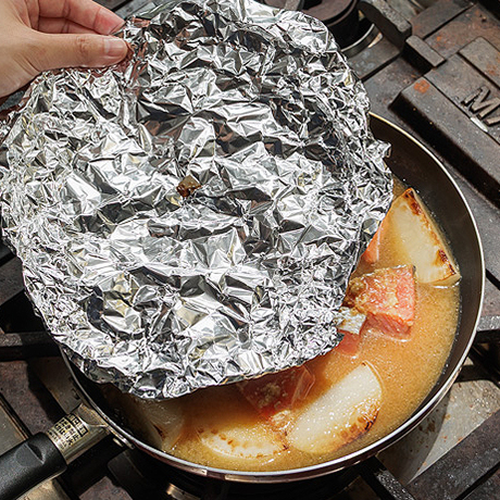手順6 手順6アルミホイルで落とし蓋をし、沸騰したらアクをとる。火を弱めて10分ほど煮る。