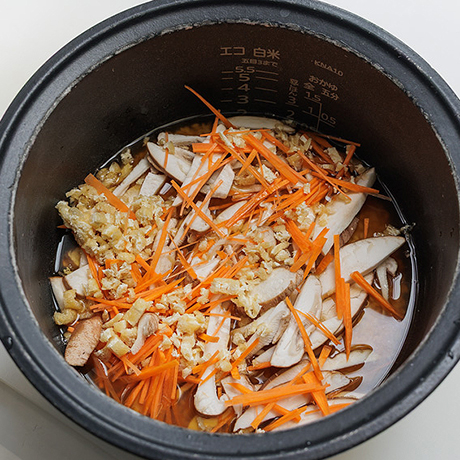 手順3 手順3炊飯器に米を入れ、aを加える。分量の目盛りまで水を入れてひと混ぜして2をのせ、炊き上げる。