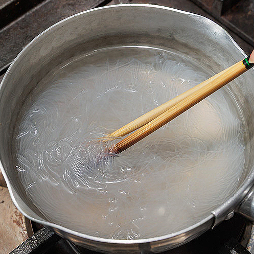 春雨はゆでて水にはなし、水気を切り、半分の長さに切る。