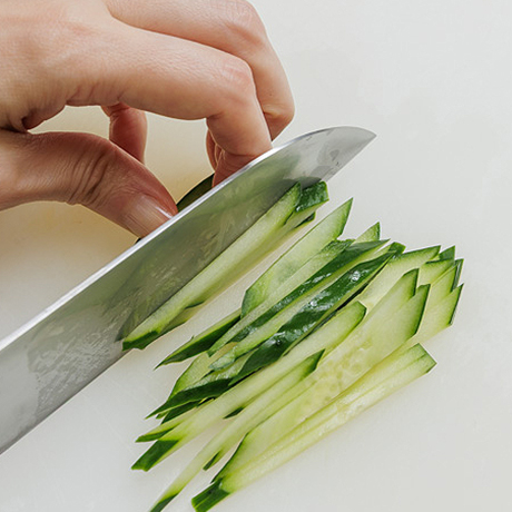 きゅうりはせん切りにする。もやしはゆでる。