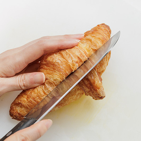手順1 手順1クロワッサンは横に切れ目を入れる。