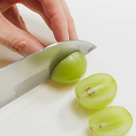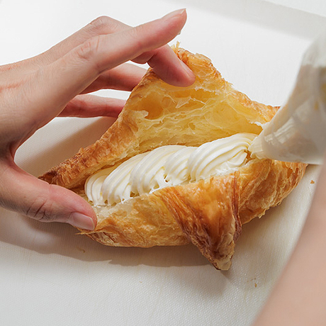 手順5 手順5クロワッサンの切れ目に4を絞り、ぶどうをのせる。