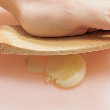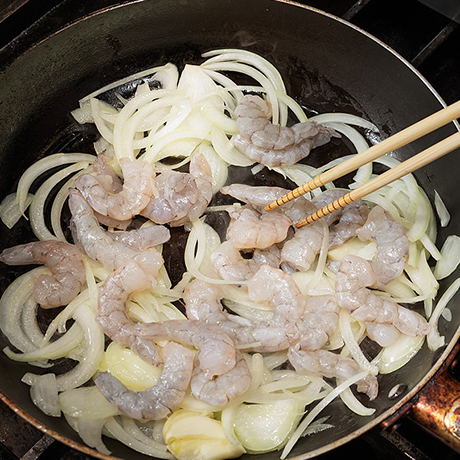 むきえびは背ワタをとる。玉ねぎは薄切りにする。にんにくは潰す。