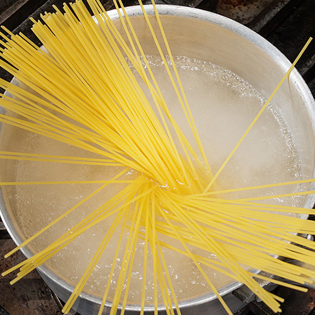 たっぷりのお湯に塩(分量外、1リットルに対して大さじ1)を入れ、スパゲッティを表示通りゆで、よく水気を切る。4に入れて和える。