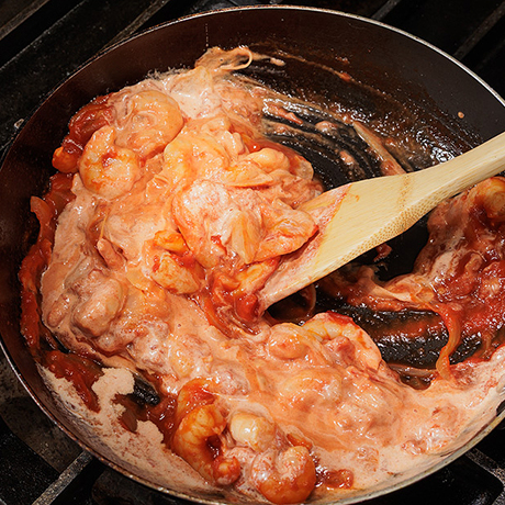 えびの色が変わったら、2に白ワインを入れる。ひと煮立ちしたらカットトマトを入れて3分ほど煮る。