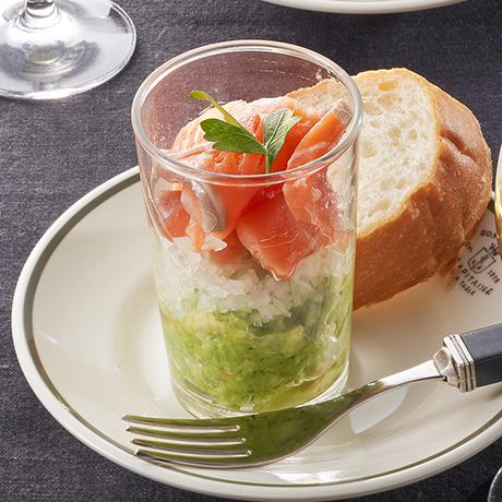 手順5器にアボカド・玉ねぎの順に盛り付け、サーモンをのせる。