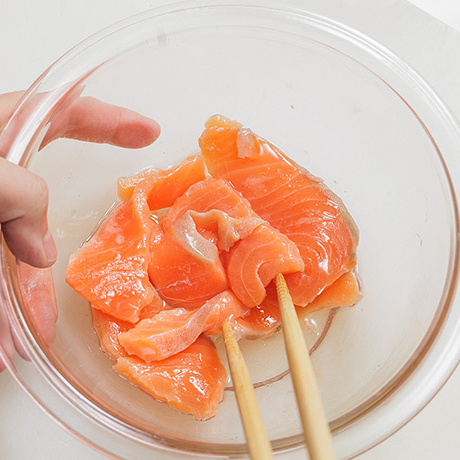 手順2サーモンはドレッシング大さじ2をかけて下味をつける。