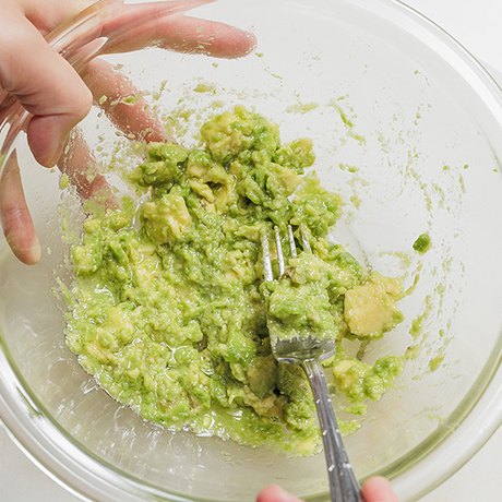 手順3アボカドは角切りにしてボウルに入れ、ドレッシング大さじ2を入れて潰す。