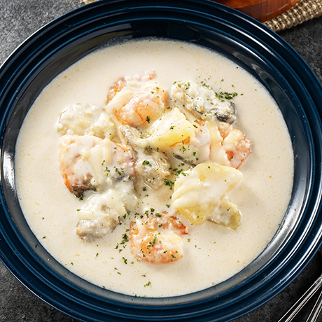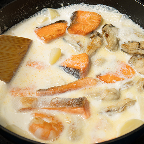 同じフライパンにバター・にんにくを入れて弱火にかける。にんにくが軽く色づいてきたら牛乳・じゃが芋・コンソメを入れて魚介を戻し入れ、フツフツしてきたら弱火で8分煮る。塩・こしょうで味を調える。