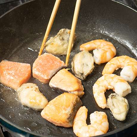 フライパンにサラダ油を熱し、1の魚介を両面焼き色がつくまで焼いてとり出す。