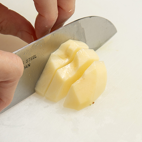 じゃが芋は1㎝幅の半月切りにする。水にさらして水気を切リ、耐熱皿に並べる。ふんわりとラップをして500Wのレンジで2分半ほど、やわらかくなるまで加熱する。