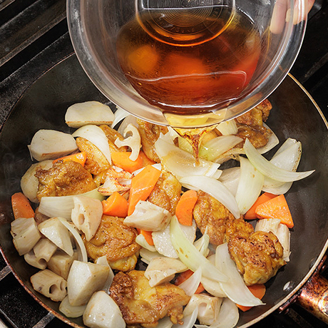 手順6玉ねぎが透き通ってきたら2を入れて焼き色が付くまで炒め、カレー粉を入れて炒める。4を加え汁気がなくなるまで炒め煮にする。