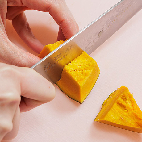 手順3かぼちゃはひと口大に切る。さつま芋・人参・れんこんは乱切りにする。さつま芋・れんこんは水にはなす。