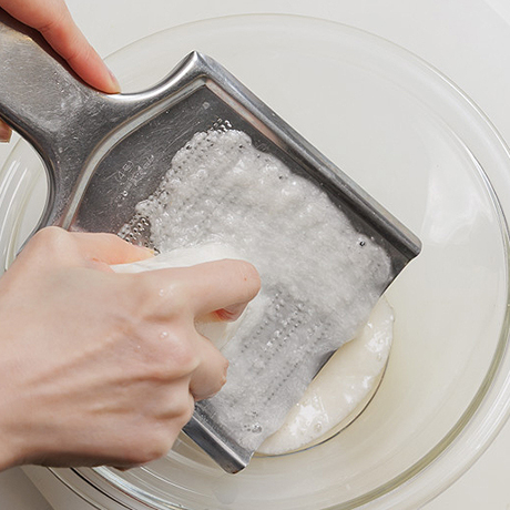 長芋は皮をむいて酢水につけて5分ほどおき、すりおろす。