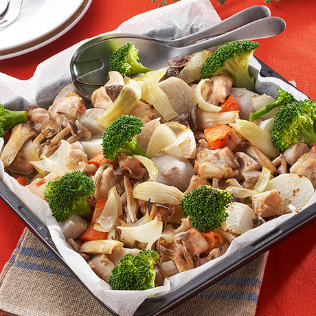 手順6天板にクッキングシートをしいて1・2・3・4をのせる。塩・オリーブオイルをかけて180℃に予熱したオーブンで25分ほど焼く。
