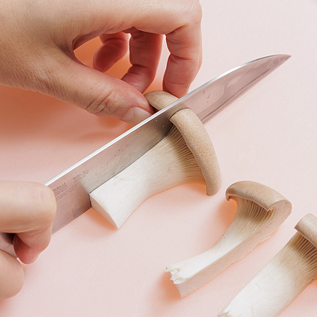 手順4しめじは石突をとり、小房に分ける。エリンギは半分の長さに切り、薄切りにする。