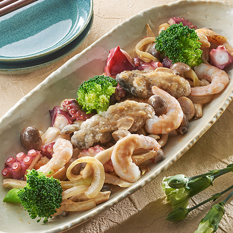 ガツンとにんにく、まろやかマヨの海鮮炒め。