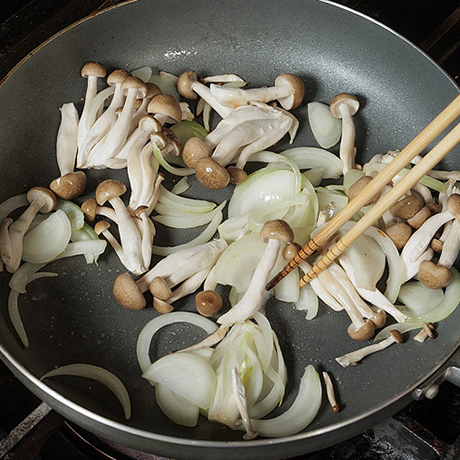 玉ねぎは薄切りにする。しめじは石突をとり、小房に分ける。