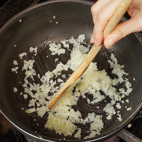 手順5-1鍋にオリーブオイルを温め、4のにんにくを入れて香りがしたら玉ねぎを入れ、透き通るまで炒める。