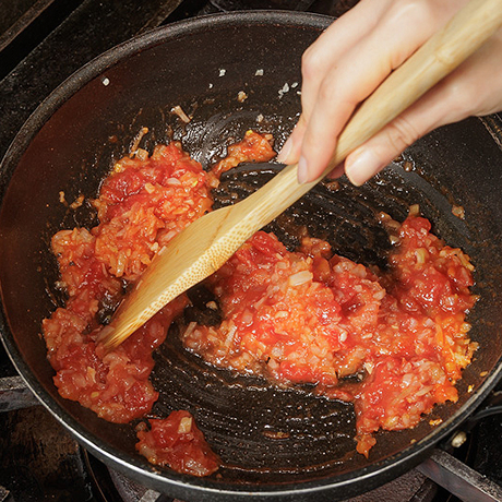 手順5-2カットトマトを入れ、トロミがついてきたら塩・こしょうで味を調え、パセリをふる。