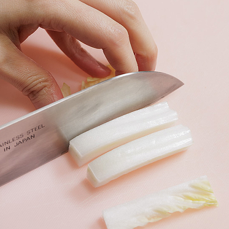 手順1-1白菜は4~5cm長さに切って1cm幅に切る。人参は短冊切りにする。玉ねぎは薄切りにする。