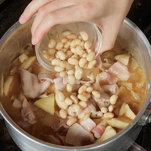 手順54に2・大豆水煮を入れ、火が通るまで煮る。